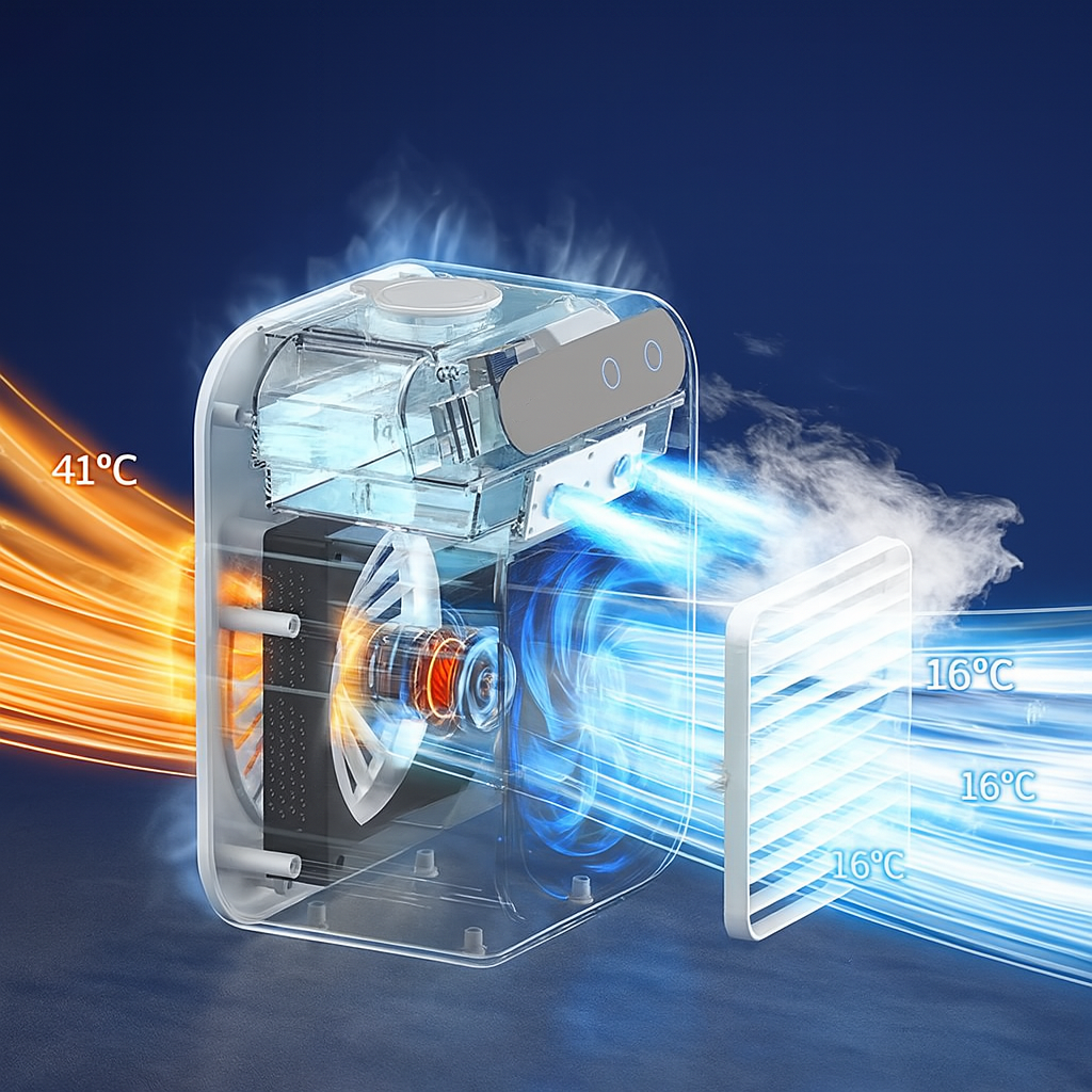 Compact, silencieux et facile à transporter, Briseo rafraîchit votre espace en quelques secondes. Idéal pour lutter contre la canicule, sans installation compliquée et sans fil.